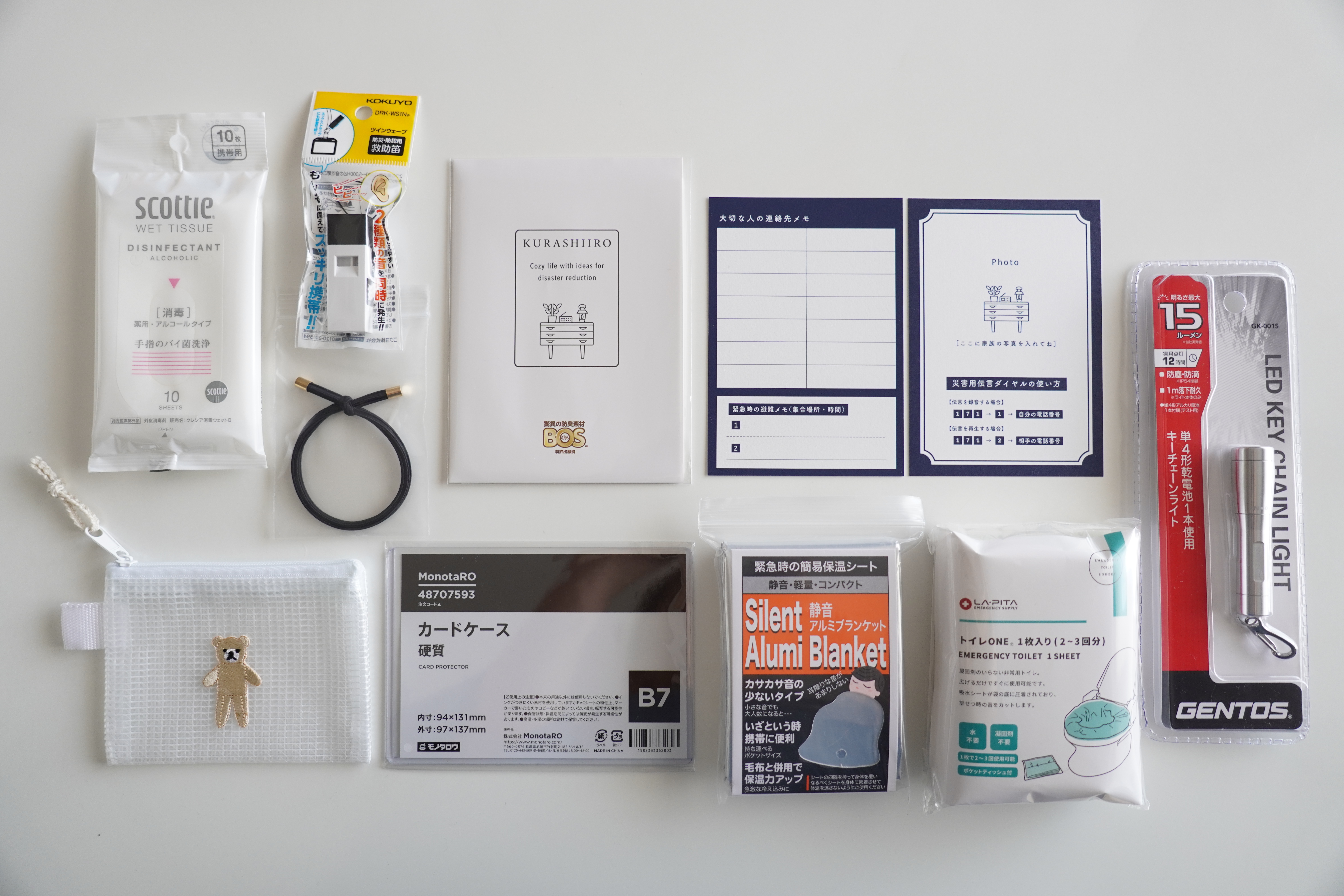 「ほんとうに欲しい!」と思えるアイテムだけをセレクトし、オリジナルの”おまもり防災ポーチ”をつくりました。
